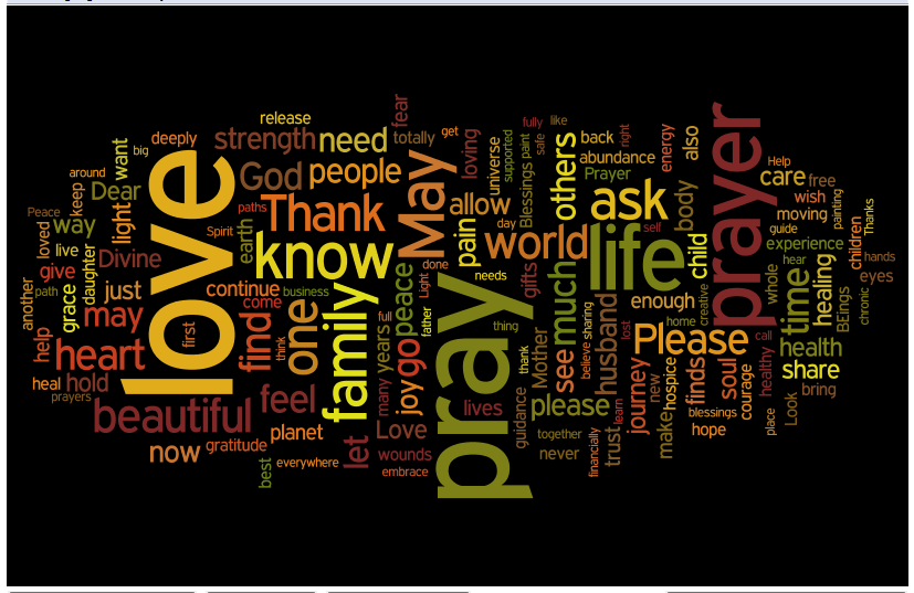 Word Cloud created from the 50+ prayers received for this prayer painting currently in progress - wordle creates clouds from themes that emerge (all names have been removed) |