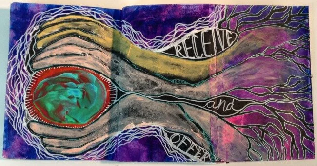 I am grateful for two places that will nurture my more intimate, personal practice as I move into the labor cycle of an offering to nurture the same in others - they are Lisa Sonora Beam's 30 Day Journal Project and Connie Hozvicka's Painting the Feminine. If I learned anything, from caregiving as a nurse, that is crucial to apply to the creative process, it's that we must fill our own cups to be able to pour into others openly and wholeheartedly.